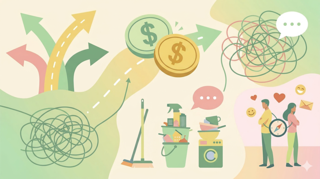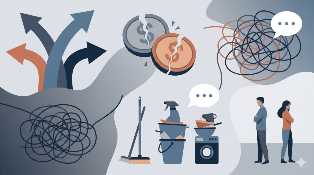 同棲を開始したり、共に過ごす時間が日常化したりすると、お互いの生活習慣の違いが明確に表面化してきます。起床や就寝のタイミング、食事の好みやマナー、部屋の整理整頓に対する基準、水回りの使い方など、一つ一つは些細に思える事柄であっても、それが毎日の生活の中で積み重なることで、次第に無視できない大きなストレスへと成長していきます。特に現代のカップルにおいて深刻な問題となりやすいのが、家事分担に関する不公平感です。共働きが一般的となった現代においても、無意識のうちに性別役割分業の意識が残存していたり、一方が「手伝う」という受動的なスタンスをとっていたりする場合、もう一方に肉体的および精神的な負担が大きく偏ることになります。「名もなき家事」と呼ばれるような、トイレットペーパーの補充やゴミの分別といった細かな作業までを含めたタスクの偏りは、単なる疲労感だけでなく「相手から大切にされていない」「対等なパートナーとして扱われていない」という深い悲しみや憤りを生み出し、それが限界に達したときに激しい言葉の応酬を伴う衝突へと発展するのです。
