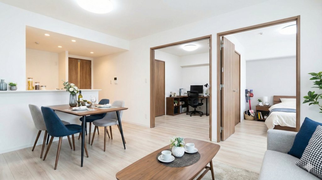 2LDKの物件は、一般的に1LDKよりも収納スペースが広く設計されていることが多いです。あるいは、2つの居室のうち1つを「ウォークインクローゼット兼納戸」として活用することも可能です。十分な収納力があれば、共用スペースであるリビングを常にすっきりと片付いた状態に保つことができ、友人を招く際も慌てる必要がありません。