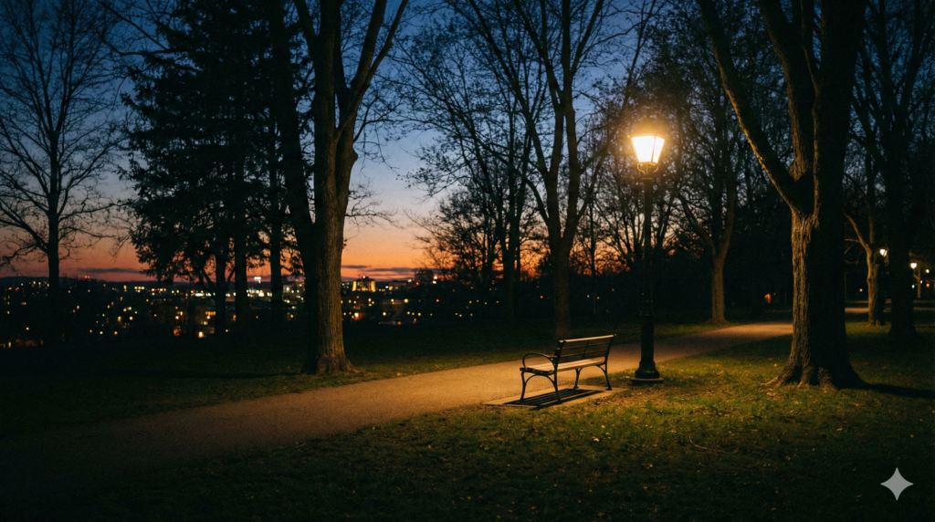 ・夕暮れ時や夜の公園は静寂と街灯の光が親密なムードを演出する