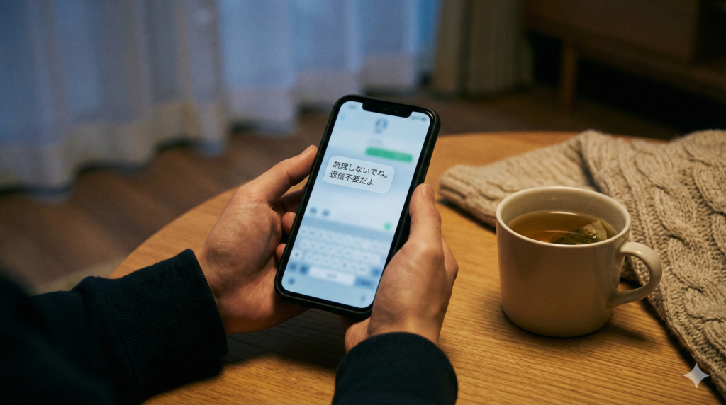 この一言があるだけで、相手は「返さなければならない」というプレッシャーから解放され、純粋に心配してくれているという事実だけを受け取ることができます。また、既読スルーを許容する姿勢を示すことで、相手の休息を最優先に考えているという深い優しさが伝わります。これは、相手に対する要求ではなく、純粋な贈与としてのコミュニケーションを成立させるための重要なテクニックです。