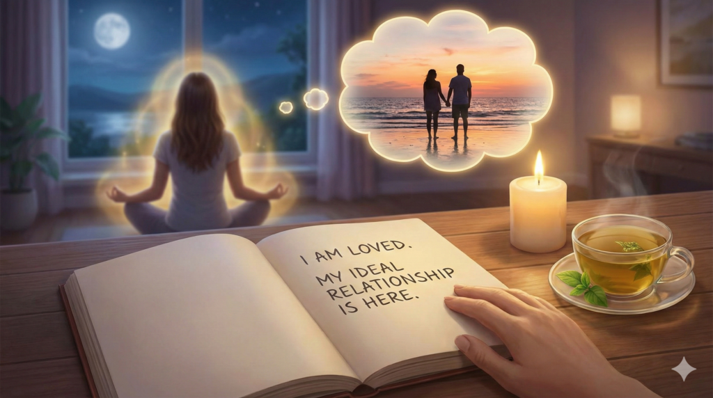 就寝前のまどろんでいる時間は、顕在意識の働きが弱まり、潜在意識の扉が大きく開いている「ゴールデンタイム」と呼ばれます。この時間に何を考えながら眠りにつくかは、潜在意識の書き換えにおいて非常に大きな意味を持ちます。一日の反省や不安を考えながら眠ると、そのネガティブな情報がダイレクトに潜在意識に届いてしまいます。これを防ぎ、恋愛成就につなげるためには、寝る前の数分間を使った瞑想が効果的です。ベッドに入り、リラックスした状態で、理想のパートナーと一緒にいる安心感や幸福感に包まれているところを想像します。具体的な会話の内容やデートの場所を思い描くのも良いですが、最も大切なのは「感覚」です。隣にいる人の体温や、満たされた心の状態を感じながら、そのまま眠りに落ちるのが理想的です。これを毎晩繰り返すことで、寝ている間に潜在意識の修正が行われます。