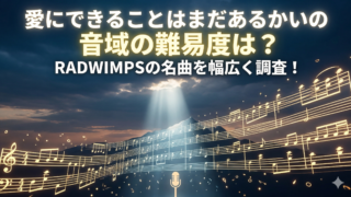 愛 愛にできることはまだあるかいの音域の難易度は?RADWIMPSの名曲を幅広く調査! 映画『天気の子』の主題歌として日本中の感動を呼んだRADWIMPSの代表曲の一つである「愛にできることはまだあるかい」。その緻密に計算された美しいメロディラインと、聴く者の魂の奥底に直接語りかけてくるような深い意味を持つ歌詞は、公開から年... 2026.04.01 愛